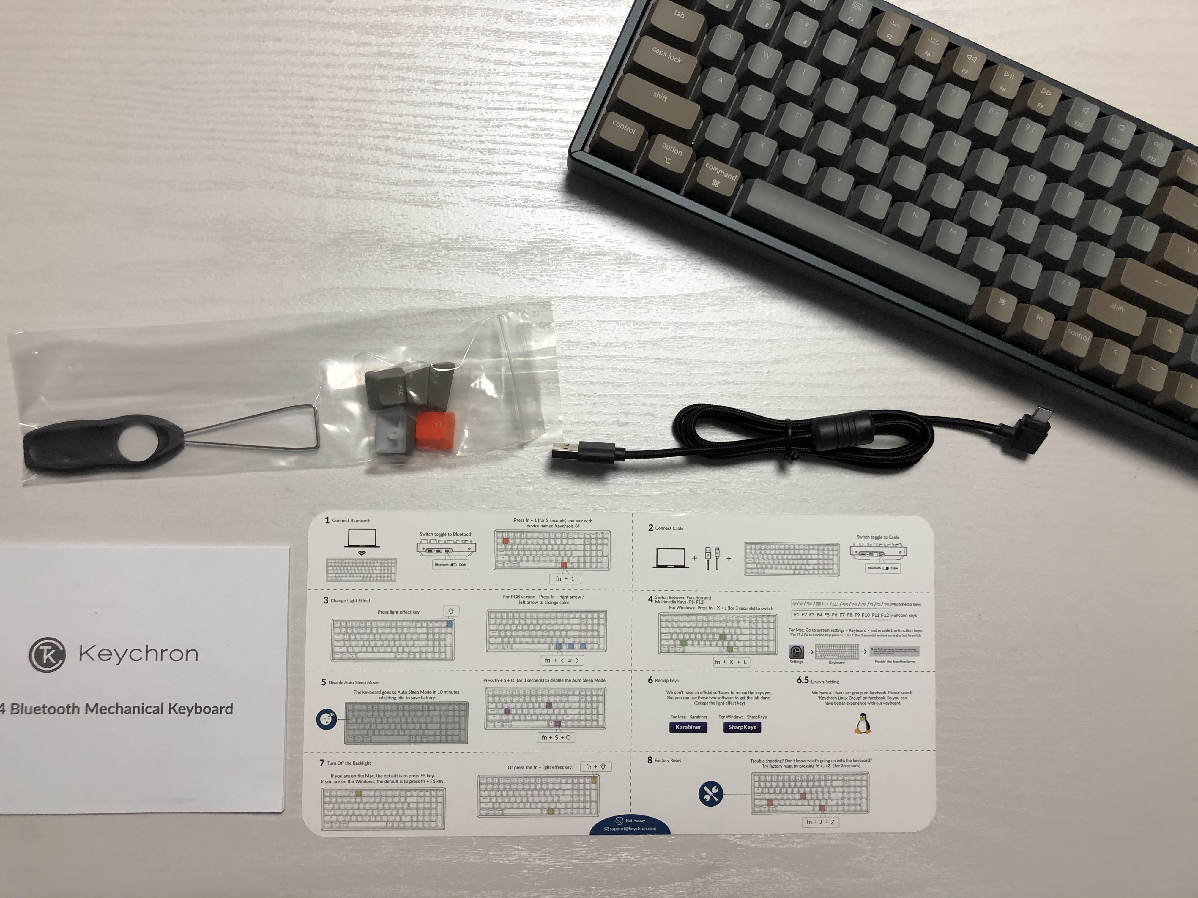 키보드 루프는 물론이고 스페어 축 2개, C타입 케이블, ESC를 포함한 MAC용 키캡, 키캡 리무버, 스위치 리무버까지 포함되어 있다