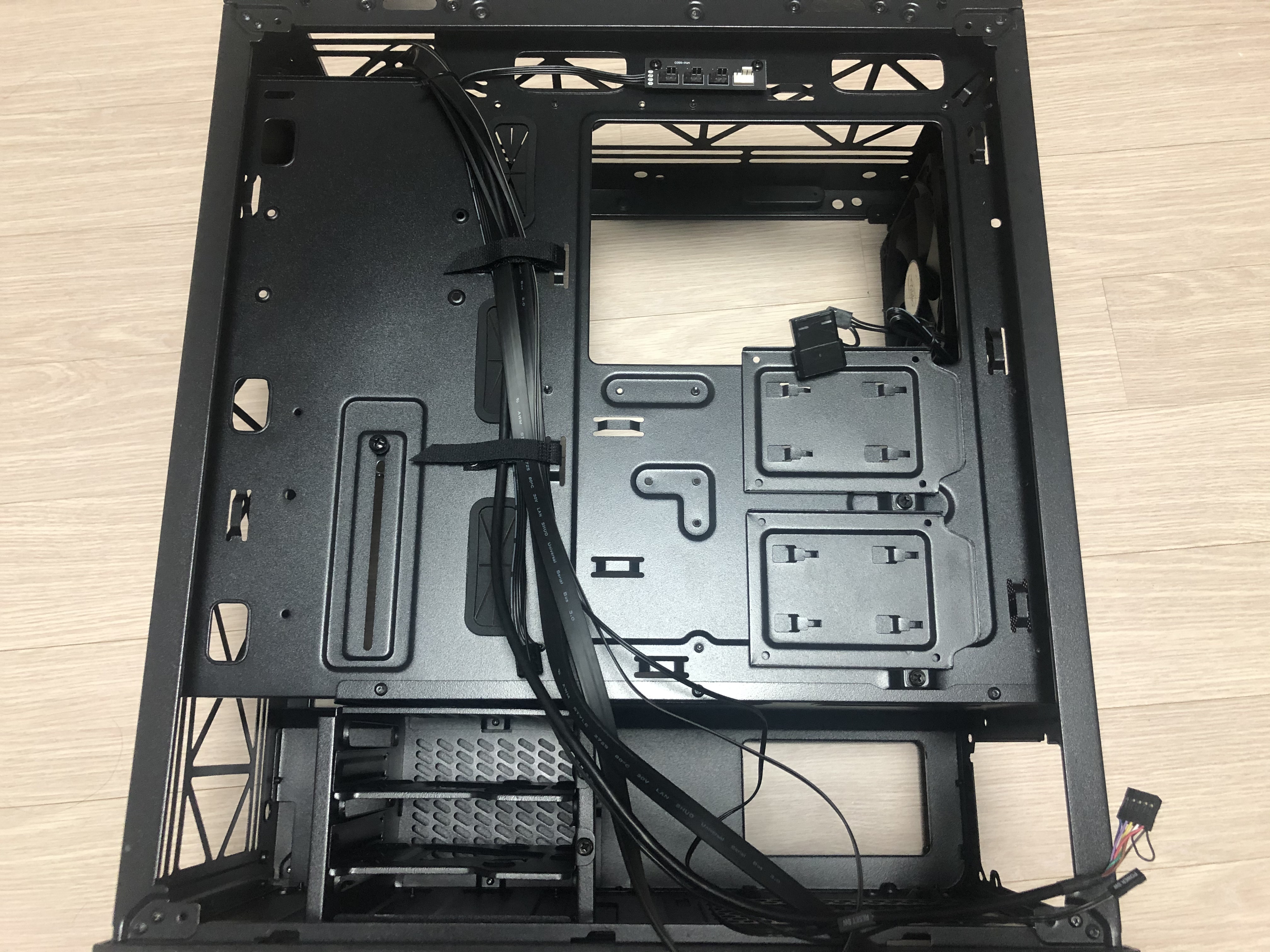 조립이 끝나긴했지만 별도로 구매한 쿨러가 아직 도착하지 않아서 미완성입니다. 디자인이 깔끔해서 너무 마음에들고 자석식 패널은 말할 것도 없습니다. 다만 개인적으로 기본 제공되는 쿨러가 하나뿐이라는 점이 아쉽고, 파워 측면이 안보이게 가려져 있으면 더 좋았을 것 같습니다.